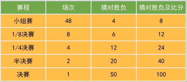 競猜賽事將以積分式排名來確定獲獎者,世界杯結束后按照累計的總分數高低,進行獎品的發放。每場競猜猜中勝負即得對應的分數,同時猜中勝負和比分則可得雙倍分數,從小組賽到決賽,每場競猜成功獲得積分將會越來越多,即使是后面加入的競猜者也有機會獲得較高的排名!